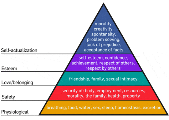 ◊ Abraham Maslow is well known for developing the hierarchy of human needs, five basic needs from lowest to highest. They are: 1. Psychological needs – the basics needed to live, for example, water, food, shelter, warmth, and sleep/rest. 2. Safety needs – so you feel secure and safe and are not afraid. 3. Love and Belonging needs – belonging socially, developing and maintaining relationships with family, friends, and associates, being part of groups. 4. Esteem needs – being recognized and respected by other people for your abilities and achievements. And 5. Self-actualization needs – the need to pursue and attain your individual potential. Maslow said it was acceptable to pursue all five needs at the same time. It is not necessary to complete need number one before moving to the subsequent needs.