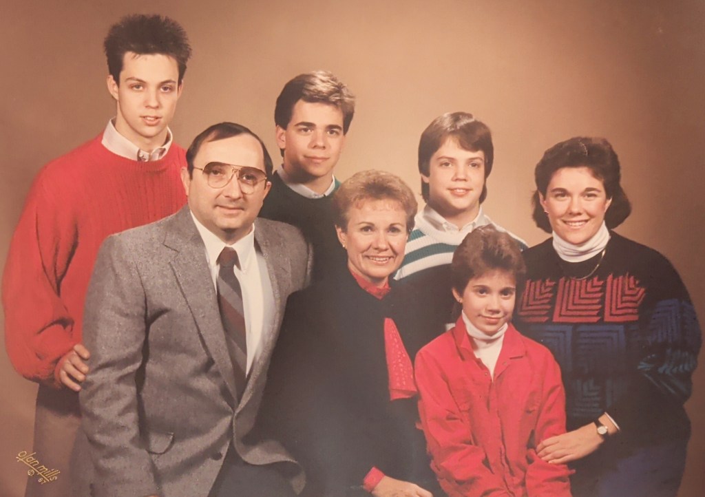 Peg and Jack moved themselves and their children – Sue, Bill, Kris, John and Jim – into a great home with a large patio and built-in swimming pool where Nana and Pop later played an integral role in teaching my sons how to swim. There were so many enjoyable weekend picnics on the patio and Sunday dinners that moved inside when the seasons changed. Pop loved to cook and Nana loved to bake, so the dinners were fantastic and always included a wonderful dessert.